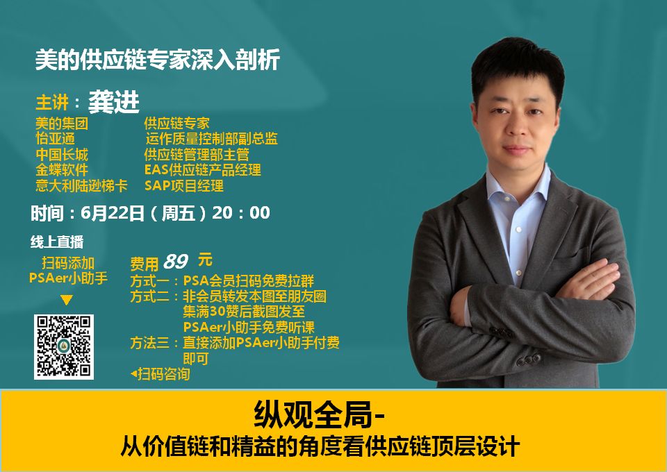 本期PSA大讲堂,我们有幸请到了美的供应链专家、中国长城供应链管理部主管、怡亚通运作质量控制部副总监——龚进,带您纵观全局,从价值链和精益的角度看供应链顶层设计。